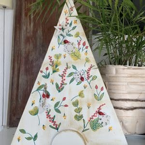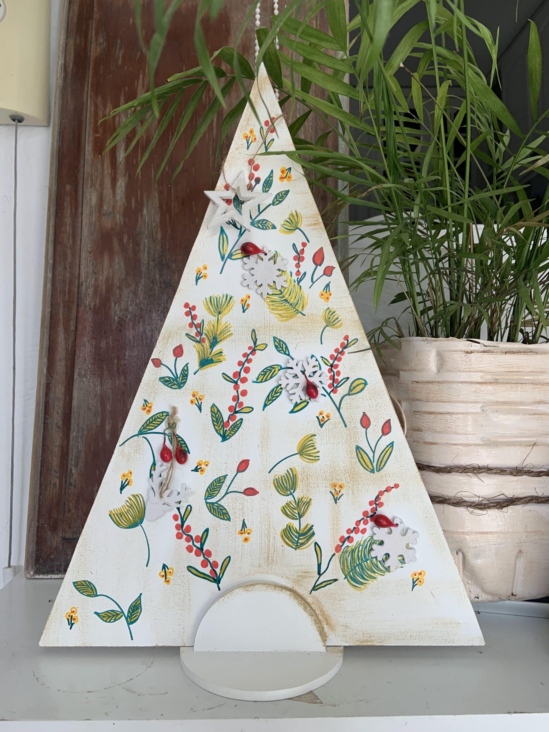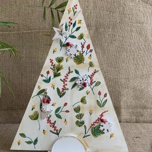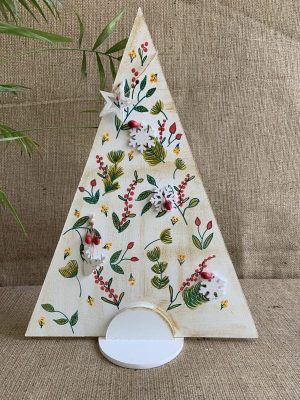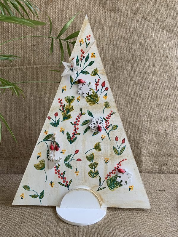 Arbolito de madera pintado a mano con apliques en madera.